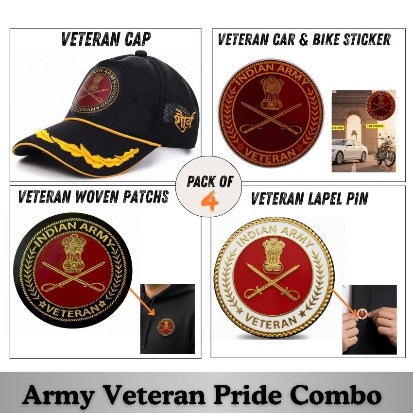 The Indian Army Officer Veteran Combo by Proud Forces is a premium honour set specially curated for Indian Army officers and veterans. This combo includes a premium  army officers’ baseball cap, force car & bike stickers, veteran woven patches, and a veteran blazer pin—designed to proudly represent service, discipline, and national pride.
