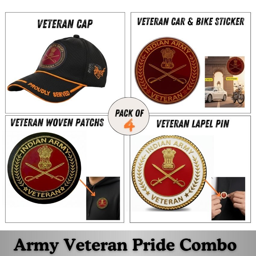Along with the cap, the combo includes Force Car & Bike Stickers, Veteran Woven Patches, and a Veteran Blazer Pin, allowing veterans to proudly display their service—whether on vehicles, jackets, blazers, or daily wear.