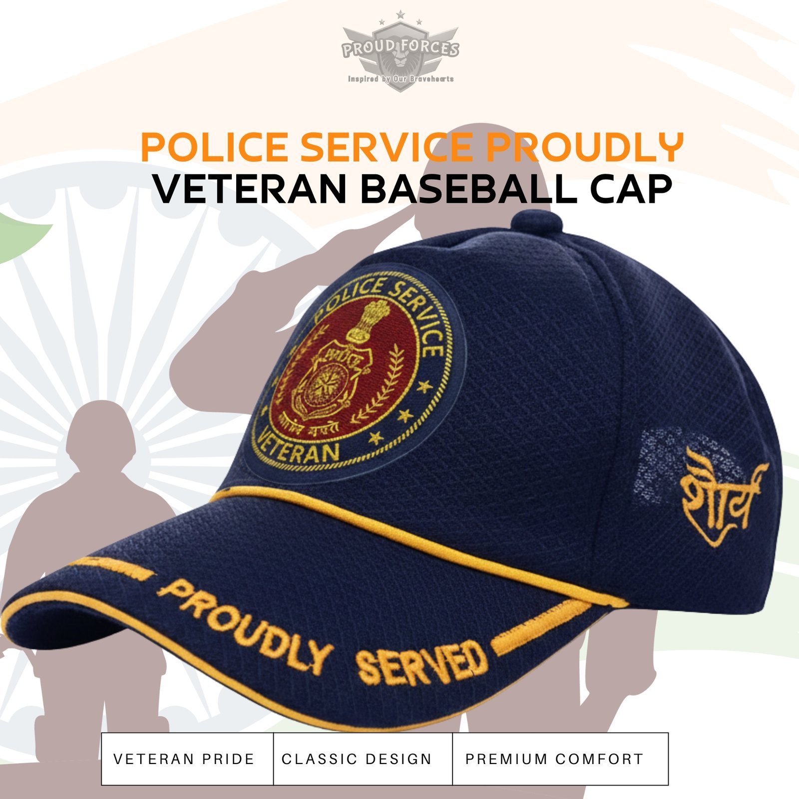 Proud Forces Premium Quality Police Service Proudly Baseball Cap (Blue Color) is designed to honour the courage, discipline, and unwavering dedication of Police Service veterans. Featuring a refined blue finish and premium craftsmanship, this cap delivers lasting comfort, durability, and a dignified look—ideal for daily wear or respectful gifting.